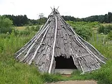 Les habitations semi-enterrées sont circulaires, de petite taille, environ 3 à 4 m de diamètre pour 12 m2[14]. Certaines ont été reconstituées par les archéologues en forme de tipi, avec une couverture végétale.