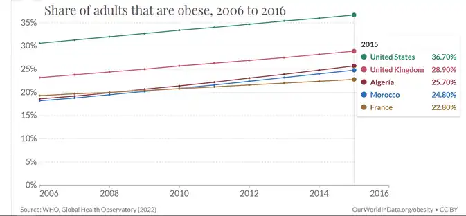 On estime en 2016 que près 24,8% des marocains sont obèses, l'alimentation devenant de plus en plus industrielle.