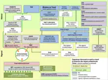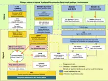 Bien-être et mieux-être au travail, prévention des maladies professionnelle, des accidents de travail, de la désinsertion professionnelle, médecine du travail, amélioration des conditions de travail : toutes ces notions et toutes ces approches, même si elles sont effectuées par des organisations distinctes, sont aujourd'hui regroupées sous le terme de Santé au travail. La politique nationale en la matière est définie dans le PNST (Plan National Santé Travail[4]), généralement élaboré pour cinq ans et présenté au Coct (Comité d'orientation des conditions de travail) par le ministre chargé du Travail qui pilote le dispositif. Le PNST est décliné, sous forme de PRST (Plan Régional Santé Travail), dans chaque région, sous la responsabilité du Préfet et du DIRECCTE. Pour assurer leur cohérence avec les politiques de Santé publique (pilotées par le ministère de la Santé), le PNST et les PRST sont « articulés » avec les plans de Santé publique (Plan Santé environnement[5], Plan Cancer[6], Plan de lutte contre les toxicomanies[7], etc.).