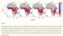 Sadie J. Ryan et al. ont étudié la réponse physiologique de l' Anophèle gambiae et du plasmodium falciparum au changement de temperature en Afrique[9]. Basée sur des futures projections climatiques et en association avec celles sur la densité de la population africaine, l'étude predit que les zones où les températures sont propices à une transmission à haut risque tout au long de l'année se déplaceront des côtes de l'Afrique de l'Ouest vers le rift Albertin, entre la République Démocratique du Congo et l'Ouganda, tandis que celles favorables à une transmission saisonnière se déplaceront vers les zones côtières sub-sahariennes[9]. Dû au changement climatique, la temperature optimale de transmission de la malaria à baisseé de 6 °C soit de 31 à 25 °C avec un interval ayant quitté de 20- 40 °C à 17-34 °C[9].
