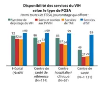Selon le rapport d'évaluation des prestations de santé des formations sanitaires (EPSS) 2017-2018, sur un total de 1380 formations sanitaires offrant le diagnostic et/ou le traitement du paludisme, 87 % possédaient des Tests de diagnostic rapide (TDR) non périmés[7]. Trois sur 10 FOSA assuraient le diagnostic microscopique (plus du trois quart des hôpitaux/cliniques, la moitié des centres de santé de référence et moins d'un quart des centres de santé[7].