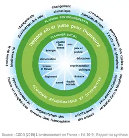 Le CGDD théorise deux frontières à ne pas franchir pour conserver les conditions d’un « bien vivre » : une frontière « intérieure » (plancher) qui représente les besoins humains de base définis comme « plancher social », et une frontière « extérieure » (« plafond environnemental ») qui symbolise la préservation de l’environnement.