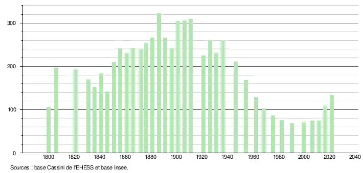 L'évolution du nombre d'habitants est connue à travers les recensements de la population effectués dans la commune depuis 1800. Pour les communes de moins de 10 000 habitants, une enquête de recensement portant sur toute la population est réalisée tous les cinq ans, les populations légales des années intermédiaires étant quant à elles estimées par interpolation ou extrapolation[10]. Pour la commune, le premier recensement exhaustif entrant dans le cadre du nouveau dispositif a été réalisé en 2006[11].