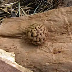Les fleurs vont du blanc au vert vers l'extérieur, et du brun au rougeâtre vers l'intérieur. Elles poussent sur les tiges, ne mesurent que 2 à 3 millimètres de diamètre, et sont parfumées[3]. Les fruits, appartenant à la catégorie des drupes, commencent à être produits au bout de quatre ans. Ils mûrissent à la fin du printemps ou en été, passant du vert au rouge, et mesurent 20 à 25 millimètres de diamètre[4]. Une couche de chair de 3 millimètres recouvre une noix ressemblant à un cerveau avec une coquille dure qui contient la graine. Le fruit est recouvert d’une peau cireuse[5].