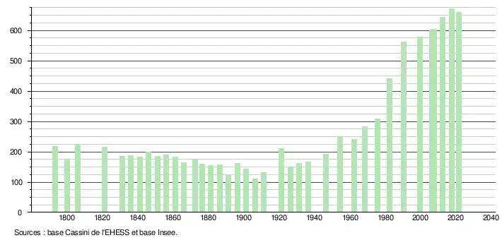 L'évolution du nombre d'habitants est connue à travers les recensements de la population effectués dans la commune depuis 1793. Pour les communes de moins de 10 000 habitants, une enquête de recensement portant sur toute la population est réalisée tous les cinq ans, les populations légales des années intermédiaires étant quant à elles estimées par interpolation ou extrapolation[25]. Pour la commune, le premier recensement exhaustif entrant dans le cadre du nouveau dispositif a été réalisé en 2007[26].