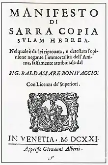 En 1621, il écrit un traité Immortalità dell’anima (Sur l’immortalité de l’âme). Selon le témoignage de Bonifacio, il aurait découvert, deux ans auparavant, que Sara ne croyait pas en l'immortalité de l'âme. C'est une accusation très sérieuse de crime contre la foi, qui peut conduire à une condamnation par l'Inquisition[1],[7]. Sara répond à Bonifacio en écrivant son Manifesto di Sarra Copia Sulam hebrea Nel quale è da lei riprovate, e detestata l’opinione negante l’Immortalità dell’Anima, falsemente attribuitale da Sig. Baldassare Bonifacio (Le Manifeste de Sara Copia Sulam, une femme juive, dans lequel elle réfute et désavoue l'opinion niant l'immortalité de l'âme, faussement attribuée à elle par le Signor Baldassare Bonifacio). Le Manifeste est dédié à son père bien-aimé, mort quand elle avait 16 ans. Dans cet ouvrage, elle défend son point de vue et attaque Bonifacio[1],[7].