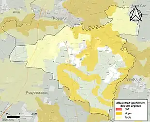 Le retrait-gonflement des sols argileux est susceptible d'engendrer des dommages importants aux bâtiments en cas d’alternance de périodes de sécheresse et de pluie. 37,5 % de la superficie communale est en aléa moyen ou fort (19,2 % au niveau départemental et 48,5 % au niveau national). Sur les 540 bâtiments dénombrés sur la commune en 2019, 74 sont en aléa moyen ou fort, soit 14 %, à comparer aux 17 % au niveau départemental et 54 % au niveau national. Une cartographie de l'exposition du territoire national au retrait gonflement des sols argileux est disponible sur le site du BRGM[24],[Carte 2].