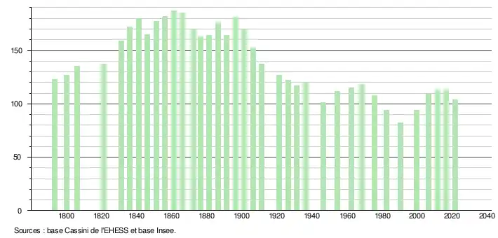 L'évolution du nombre d'habitants est connue à travers les recensements de la population effectués dans la commune depuis 1793. Pour les communes de moins de 10 000 habitants, une enquête de recensement portant sur toute la population est réalisée tous les cinq ans, les populations légales des années intermédiaires étant quant à elles estimées par interpolation ou extrapolation[14]. Pour la commune, le premier recensement exhaustif entrant dans le cadre du nouveau dispositif a été réalisé en 2006[15].