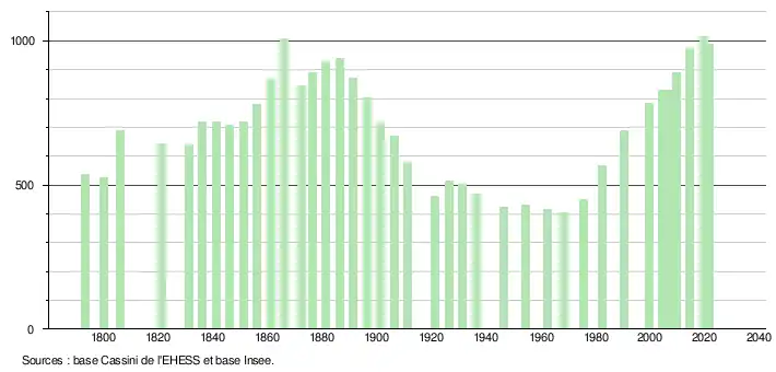 L'évolution du nombre d'habitants est connue à travers les recensements de la population effectués dans la commune depuis 1793. Pour les communes de moins de 10 000 habitants, une enquête de recensement portant sur toute la population est réalisée tous les cinq ans, les populations légales des années intermédiaires étant quant à elles estimées par interpolation ou extrapolation[13]. Pour la commune, le premier recensement exhaustif entrant dans le cadre du nouveau dispositif a été réalisé en 2004[14].