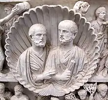 Ce style de sarcophage, typique de l'époque constantinienne, se caractérise par la superposition de deux niveaux[2]. Au centre du registre supérieur, un portrait sculpté, dans une niche en forme de coquille, le clipeus, représente le ou les défunts[2].
