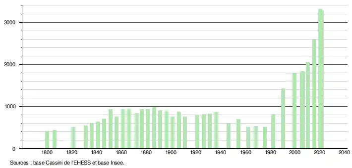 L'évolution du nombre d'habitants est connue à travers les recensements de la population effectués dans la commune depuis 1800. Pour les communes de moins de 10 000 habitants, une enquête de recensement portant sur toute la population est réalisée tous les cinq ans, les populations légales des années intermédiaires étant quant à elles estimées par interpolation ou extrapolation[10]. Pour la commune, le premier recensement exhaustif entrant dans le cadre du nouveau dispositif a été réalisé en 2005[11].