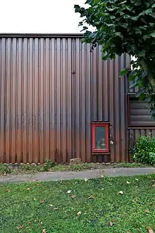 Les façades sont recouvertes d’un bardage en tôle d’acier corten nervurée. "Seuls des oculis saillants contrastent avec la matérialité des étages inférieurs : pour la plupart recouverts de panneaux de fibre-ciment, ils étaient initialement bardés de multiplex"[2].