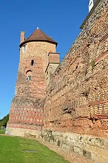 Plusieurs vestiges de la période gallo-romaine ont été mis au jour en Sarthe. L'enceinte romaine du Mans a été édifiée à la fin du IIIe siècle pour résister aux invasions barbares. Elle forme un quadrilatère irrégulier de 450 m de long sur 200 m de large[34]. Sur la commune d'Aubigné-Racan, dans le sud du département, le site archéologique de Cherré regroupe un théâtre, un forum, un temple, des thermes ainsi qu'un aqueduc[35]. Au Mans, un trésor de 152 pièces d'or gauloises a été découvert sur les bords de l'Huisne au début des années 1990[36],[37].