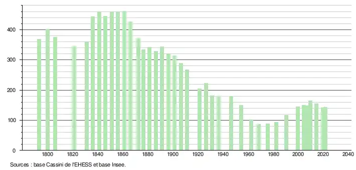 L'évolution du nombre d'habitants est connue à travers les recensements de la population effectués dans la commune depuis 1793. Pour les communes de moins de 10 000 habitants, une enquête de recensement portant sur toute la population est réalisée tous les cinq ans, les populations légales des années intermédiaires étant quant à elles estimées par interpolation ou extrapolation[20]. Pour la commune, le premier recensement exhaustif entrant dans le cadre du nouveau dispositif a été réalisé en 2004[21].