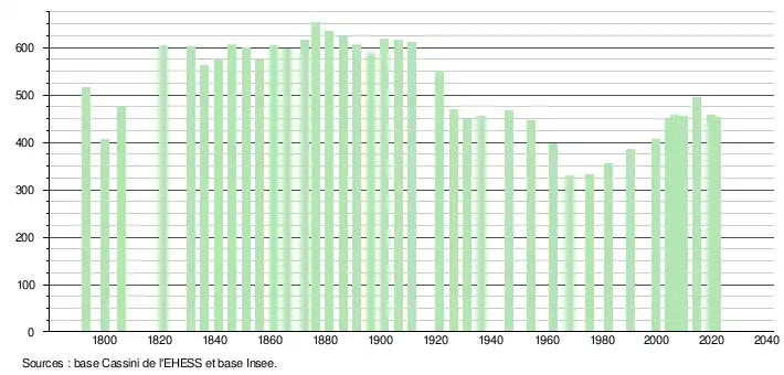 L'évolution du nombre d'habitants est connue à travers les recensements de la population effectués dans la commune depuis 1793. Pour les communes de moins de 10 000 habitants, une enquête de recensement portant sur toute la population est réalisée tous les cinq ans, les populations légales des années intermédiaires étant quant à elles estimées par interpolation ou extrapolation[37]. Pour la commune, le premier recensement exhaustif entrant dans le cadre du nouveau dispositif a été réalisé en 2004[38].