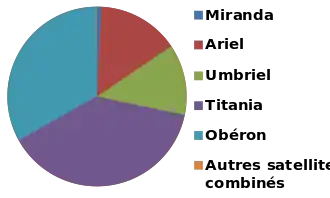 Le système de satellites de la planète Uranus est moins massif que ceux des trois autres géantes gazeuses. La masse combinée de ses cinq satellites majeurs est inférieure à la moitié de celle de Triton, la septième plus grande lune du Système solaire[30]. Le rayon du plus grand satellite, Titania, est de 788,9 km, soit la moitié de celui de la Lune, mais légèrement plus élevé que la moitié de celui de Rhéa, la deuxième plus grande lune de Saturne ; Titania est le huitième plus grand satellite du Système solaire. La masse d'Uranus est d'environ 10 000 fois celle de ses lunes[31].
