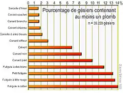 - De 1996 à 1998, 1,2 % des gélinottes huppées observées au Canada portaient des grenailles de plomb dans le gésier[46]. Le tétras du Canada et le lagopède des saules en présentaient aussi mais en moins grand nombre. Le taux moyen de plomb dans la chair était d'environ 6 μg/g (en poids sec), avec parfois un risque de saturnisme pour le consommateur[46] ;
