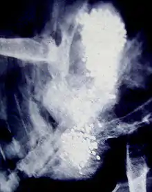 - Le diagnostic est confirmé chez un oiseau mort si son foie contient 6-8 ppm ou plus de plomb (poids humide) et/ou que de la grenaille de plomb est trouvée dans le gésier (l'observation aux rayons X est alors préférable pour distinguer le plomb des graviers). L'absence de billes de plomb dans le gésier ne signifie pas qu'un oiseau n'est pas mort de saturnisme, car les billes de plomb se dissolvent totalement après quelques dizaines d'heures[56] ;