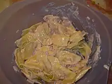 Elle se compose de crème, jambon, fromage, noix et champignons.