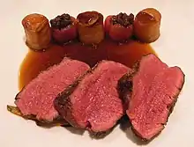 Aiguillettes de canard au thym, sauce au vin rouge et raisins frais, servies avec des asperges et des pommes de terre. | |