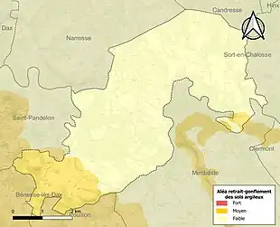 Le retrait-gonflement des sols argileux est susceptible d'engendrer des dommages importants aux bâtiments en cas d’alternance de périodes de sécheresse et de pluie. 16,7 % de la superficie communale est en aléa moyen ou fort (19,2 % au niveau départemental et 48,5 % au niveau national). Sur les 692 bâtiments dénombrés sur la commune en 2019, 42 sont en aléa moyen ou fort, soit 6 %, à comparer aux 17 % au niveau départemental et 54 % au niveau national. Une cartographie de l'exposition du territoire national au retrait gonflement des sols argileux est disponible sur le site du BRGM[23],[Carte 2].