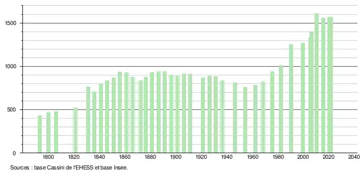 L'évolution du nombre d'habitants est connue à travers les recensements de la population effectués dans la commune depuis 1793. Pour les communes de moins de 10 000 habitants, une enquête de recensement portant sur toute la population est réalisée tous les cinq ans, les populations légales des années intermédiaires étant quant à elles estimées par interpolation ou extrapolation[26]. Pour la commune, le premier recensement exhaustif entrant dans le cadre du nouveau dispositif a été réalisé en 2005[27].