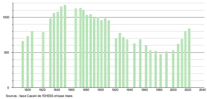 L'évolution du nombre d'habitants est connue à travers les recensements de la population effectués dans la commune depuis 1793. Pour les communes de moins de 10 000 habitants, une enquête de recensement portant sur toute la population est réalisée tous les cinq ans, les populations légales des années intermédiaires étant quant à elles estimées par interpolation ou extrapolation[19]. Pour la commune, le premier recensement exhaustif entrant dans le cadre du nouveau dispositif a été réalisé en 2006[20].