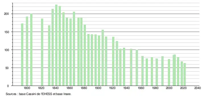 L'évolution du nombre d'habitants est connue à travers les recensements de la population effectués dans la commune depuis 1793. Pour les communes de moins de 10 000 habitants, une enquête de recensement portant sur toute la population est réalisée tous les cinq ans, les populations légales des années intermédiaires étant quant à elles estimées par interpolation ou extrapolation[16]. Pour la commune, le premier recensement exhaustif entrant dans le cadre du nouveau dispositif a été réalisé en 2007[17].
