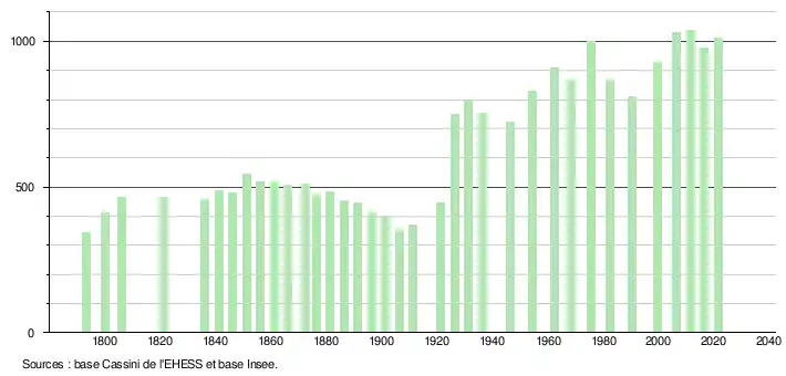 L'évolution du nombre d'habitants est connue à travers les recensements de la population effectués dans la commune depuis 1793. Pour les communes de moins de 10 000 habitants, une enquête de recensement portant sur toute la population est réalisée tous les cinq ans, les populations légales des années intermédiaires étant quant à elles estimées par interpolation ou extrapolation[14]. Pour la commune, le premier recensement exhaustif entrant dans le cadre du nouveau dispositif a été réalisé en 2006[15].