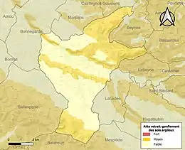 Le retrait-gonflement des sols argileux est susceptible d'engendrer des dommages importants aux bâtiments en cas d’alternance de périodes de sécheresse et de pluie[33]. 47,5 % de la superficie communale est en aléa moyen ou fort (59 % au niveau départemental et 48,5 % au niveau national)[Carte 3]. Depuis le , en application de la loi ELAN, différentes contraintes s'imposent aux vendeurs, maîtres d'ouvrages ou constructeurs de biens situés dans une zone classée en aléa moyen ou fort[Note 5],[34].