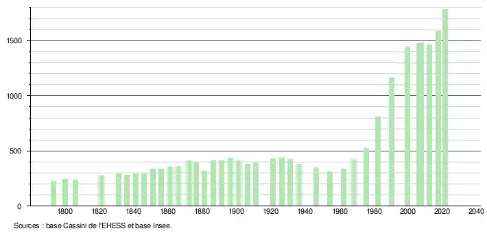 L'évolution du nombre d'habitants est connue à travers les recensements de la population effectués dans la commune depuis 1793. Pour les communes de moins de 10 000 habitants, une enquête de recensement portant sur toute la population est réalisée tous les cinq ans, les populations légales des années intermédiaires étant quant à elles estimées par interpolation ou extrapolation[25]. Pour la commune, le premier recensement exhaustif entrant dans le cadre du nouveau dispositif a été réalisé en 2007[26].