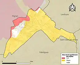 Le retrait-gonflement des sols argileux est susceptible d'engendrer des dommages importants aux bâtiments en cas d’alternance de périodes de sécheresse et de pluie. 90,9 % de la superficie communale est en aléa moyen ou fort (59,3 % au niveau départemental et 48,5 % au niveau national). Sur les 579 bâtiments dénombrés sur la commune en 2019, 417 sont en aléa moyen ou fort, soit 72 %, à comparer aux 85 % au niveau départemental et 54 % au niveau national. Une cartographie de l'exposition du territoire national au retrait gonflement des sols argileux est disponible sur le site du BRGM[21],[Carte 2].