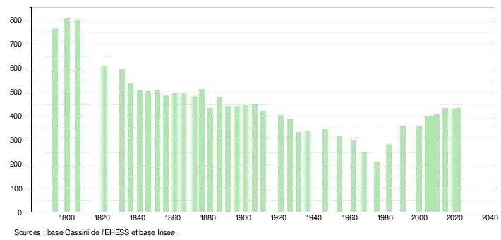 L'évolution du nombre d'habitants est connue à travers les recensements de la population effectués dans la commune depuis 1793. Pour les communes de moins de 10 000 habitants, une enquête de recensement portant sur toute la population est réalisée tous les cinq ans, les populations légales des années intermédiaires étant quant à elles estimées par interpolation ou extrapolation[20]. Pour la commune, le premier recensement exhaustif entrant dans le cadre du nouveau dispositif a été réalisé en 2004[21].