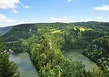 - En bateau-mouche à la belle saison : au départ de Villers-le-Lac[5] ou des Brenets[6], grâce à une croisière commentée au cœur des gorges du Doubs comprenant une escale au bout du lac des Brenets avec accès aux belvédères (600 m de marche).