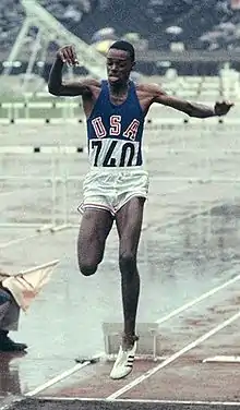Lors des Jeux olympiques de 1968 à Mexico, l'Américain Bob Beamon réalise dès sa première tentative un saut à 8,90 m et améliore de 55 cm le record du monde co-détenu alors par Ralph Boston et Igor Ter-Ovanessian. Beamon bénéficie de conditions exceptionnelles lors de son saut, l'altitude élevée de la ville de Mexico (2 300 m), la piste d'élan en synthétique, ainsi qu'un vent favorable de 2 m/s[23]. L'Est-allemand Klaus Beer est médaillé d'argent avec 8,19 m et Ralph Boston, qui monte pour la troisième fois consécutive sur le podium après l'or en 1960 et l'argent en 1964, est médaillé de bronze avec un saut à 8,16 m après avoir amélioré le record olympique la veille en qualifications avec 8,27 m[24]. Igor Ter-Ovanessian termine au pied du podium avec 8,12 m.