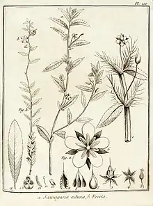En 1775, le botaniste Aublet propose le protologue suivant pour Sauvagesia erecta Aubl., 1775 (synonyme de Sauvagesia sprengelii A. St.-Hil., 1723)[15] :