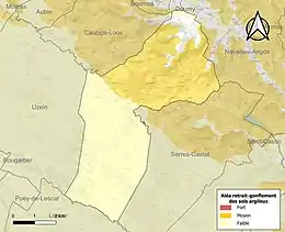 Le retrait-gonflement des sols argileux est susceptible d'engendrer des dommages importants aux bâtiments en cas d’alternance de périodes de sécheresse et de pluie[34]. 40,4 % de la superficie communale est en aléa moyen ou fort (59 % au niveau départemental et 48,5 % au niveau national)[Carte 3]. Depuis le , en application de la loi ELAN, différentes contraintes s'imposent aux vendeurs, maîtres d'ouvrages ou constructeurs de biens situés dans une zone classée en aléa moyen ou fort[Note 5],[35].