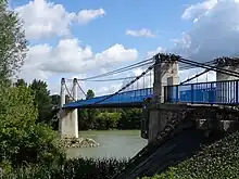 - Le pont suspendu : Le pont suspendu de Sauveterre-Saint-Denis a été construit en 1845. Franchissant la Garonne via la D 308, il est situé en amont d'Agen entre le pont de Layrac (D 17) et le pont de Saint-Nicolas - Saint-Romain (D 114). Cet ouvrage est constitué de deux travées indépendantes de 98,70 m de portée chacune, une pile en rivière, une chaussée de 2,35 m de largeur, deux trottoirs de 1,15 m. Le tout est fait en platelage bois et l'ouvrage est limité à 3,5 tonnes et à 2,90 m en hauteur. D' à , le pont a fait l'objet d'une réfection à neuf. Ainsi rénové, il a été inauguré le [35].