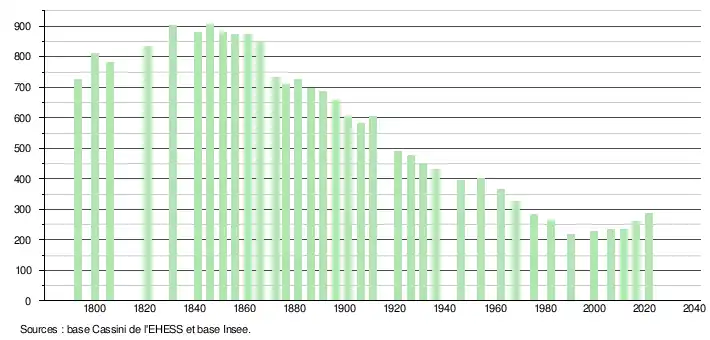 L'évolution du nombre d'habitants est connue à travers les recensements de la population effectués dans la commune depuis 1793. Pour les communes de moins de 10 000 habitants, une enquête de recensement portant sur toute la population est réalisée tous les cinq ans, les populations légales des années intermédiaires étant quant à elles estimées par interpolation ou extrapolation[31]. Pour la commune, le premier recensement exhaustif entrant dans le cadre du nouveau dispositif a été réalisé en 2006[32].