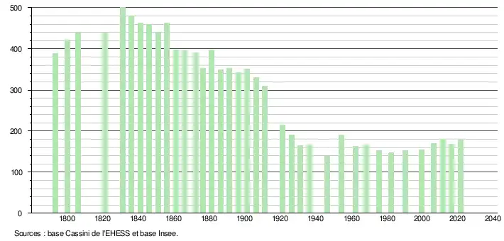 | L'évolution du nombre d'habitants est connue à travers les recensements de la population effectués dans la commune depuis 1793. Pour les communes de moins de 10 000 habitants, une enquête de recensement portant sur toute la population est réalisée tous les cinq ans, les populations légales des années intermédiaires étant quant à elles estimées par interpolation ou extrapolation[35]. Pour la commune, le premier recensement exhaustif entrant dans le cadre du nouveau dispositif a été réalisé en 2006[36]. En 2021, la commune comptait 178 habitants[Note 5], en augmentation de 2,89 % par rapport à 2015 (Tarn : +1,82 %, France hors Mayotte : +1,84 %). |