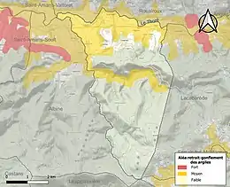 La commune est vulnérable au risque de mouvements de terrains constitué principalement du retrait-gonflement des sols argileux[27]. Cet aléa est susceptible d'engendrer des dommages importants aux bâtiments en cas d’alternance de périodes de sécheresse et de pluie. 29,8 % de la superficie communale est en aléa moyen ou fort (76,3 % au niveau départemental et 48,5 % au niveau national). Sur les 118 bâtiments dénombrés sur la commune en 2019, 109 sont en aléa moyen ou fort, soit 92 %, à comparer aux 90 % au niveau départemental et 54 % au niveau national. Une cartographie de l'exposition du territoire national au retrait gonflement des sols argileux est disponible sur le site du BRGM[28],[Carte 3].