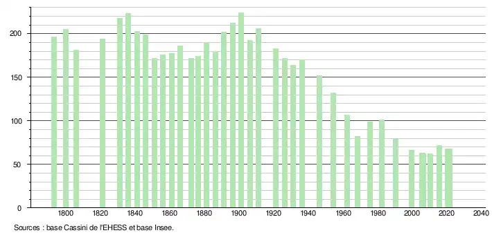 L'évolution du nombre d'habitants est connue à travers les recensements de la population effectués dans la commune depuis 1793. Pour les communes de moins de 10 000 habitants, une enquête de recensement portant sur toute la population est réalisée tous les cinq ans, les populations légales des années intermédiaires étant quant à elles estimées par interpolation ou extrapolation[15]. Pour la commune, le premier recensement exhaustif entrant dans le cadre du nouveau dispositif a été réalisé en 2005[16].