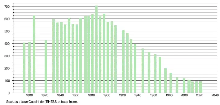 L'évolution du nombre d'habitants est connue à travers les recensements de la population effectués dans la commune depuis 1793. Pour les communes de moins de 10 000 habitants, une enquête de recensement portant sur toute la population est réalisée tous les cinq ans, les populations légales des années intermédiaires étant quant à elles estimées par interpolation ou extrapolation[31]. Pour la commune, le premier recensement exhaustif entrant dans le cadre du nouveau dispositif a été réalisé en 2005[32].