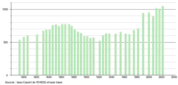 L'évolution du nombre d'habitants est connue à travers les recensements de la population effectués dans la commune depuis 1793. Pour les communes de moins de 10 000 habitants, une enquête de recensement portant sur toute la population est réalisée tous les cinq ans, les populations légales des années intermédiaires étant quant à elles estimées par interpolation ou extrapolation[19]. Pour la commune, le premier recensement exhaustif entrant dans le cadre du nouveau dispositif a été réalisé en 2006[20].