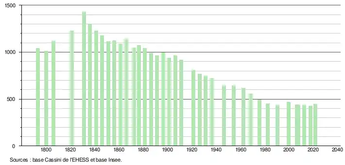 L'évolution du nombre d'habitants est connue à travers les recensements de la population effectués dans la commune depuis 1793. Pour les communes de moins de 10 000 habitants, une enquête de recensement portant sur toute la population est réalisée tous les cinq ans, les populations légales des années intermédiaires étant quant à elles estimées par interpolation ou extrapolation[29]. Pour la commune, le premier recensement exhaustif entrant dans le cadre du nouveau dispositif a été réalisé en 2007[30].