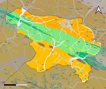 L'occupation des sols de la commune, telle qu'elle ressort de la base de données européenne d’occupation biophysique des sols Corine Land Cover (CLC), est marquée par l'importance des territoires agricoles (72 % en 2018), une proportion sensiblement équivalente à celle de 1990 (72,6 %). La répartition détaillée en 2018 est la suivante : zones agricoles hétérogènes (57,5 %), forêts (27,1 %), prairies (9,8 %), terres arables (4,7 %), zones urbanisées (1 %)[35]. L'évolution de l’occupation des sols de la commune et de ses infrastructures peut être observée sur les différentes représentations cartographiques du territoire : la carte de Cassini (XVIIIe siècle), la carte d'état-major (1820-1866) et les cartes ou photos aériennes de l'IGN pour la période actuelle (1950 à aujourd'hui)[Carte 3].