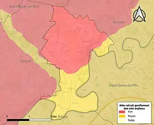 Le retrait-gonflement des sols argileux est susceptible d'engendrer des dommages importants aux bâtiments en cas d’alternance de périodes de sécheresse et de pluie. La totalité de la commune est en aléa moyen ou fort (67,4 % au niveau départemental et 48,5 % au niveau national). Sur les 237 bâtiments dénombrés sur la commune en 2019, 237 sont en aléa moyen ou fort, soit 100 %, à comparer aux 84 % au niveau départemental et 54 % au niveau national. Une cartographie de l'exposition du territoire national au retrait gonflement des sols argileux est disponible sur le site du BRGM[18],[Carte 2].