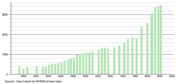 L'évolution du nombre d'habitants est connue à travers les recensements de la population effectués dans la commune depuis 1793. Pour les communes de moins de 10 000 habitants, une enquête de recensement portant sur toute la population est réalisée tous les cinq ans, les populations légales des années intermédiaires étant quant à elles estimées par interpolation ou extrapolation[18]. Pour la commune, le premier recensement exhaustif entrant dans le cadre du nouveau dispositif a été réalisé en 2007[19].