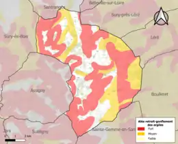 La commune est vulnérable au risque de mouvements de terrains constitué principalement du retrait-gonflement des sols argileux[15]. Cet aléa est susceptible d'engendrer des dommages importants aux bâtiments en cas d’alternance de périodes de sécheresse et de pluie. 73,8 % de la superficie communale est en aléa moyen ou fort (90 % au niveau départemental et 48,5 % au niveau national). Sur les 723 bâtiments dénombrés sur la commune en 2019, 551 sont en aléa moyen ou fort, soit 76 %, à comparer aux 83 % au niveau départemental et 54 % au niveau national. Une cartographie de l'exposition du territoire national au retrait gonflement des sols argileux est disponible sur le site du BRGM[16],[Carte 2].