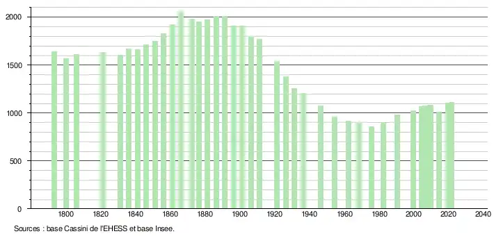 L'évolution du nombre d'habitants est connue à travers les recensements de la population effectués dans la commune depuis 1793. Pour les communes de moins de 10 000 habitants, une enquête de recensement portant sur toute la population est réalisée tous les cinq ans, les populations légales des années intermédiaires étant quant à elles estimées par interpolation ou extrapolation[21]. Pour la commune, le premier recensement exhaustif entrant dans le cadre du nouveau dispositif a été réalisé en 2004[22].